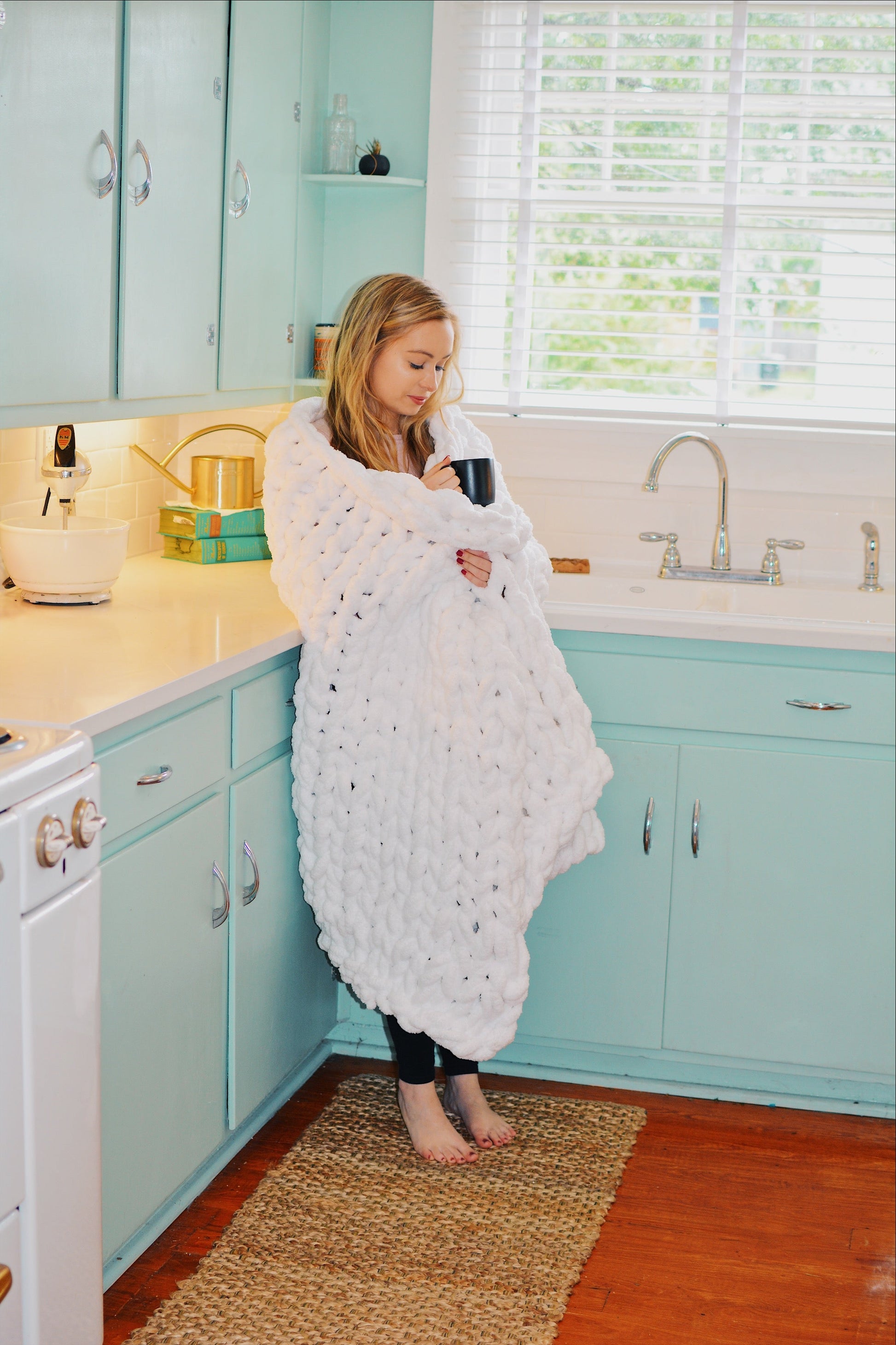 This oversized chunky-knit blanket is perfect for wrapping yourself up in or draping across your couch or bed! Each blanket is double hand-knit in TN and is made using incredibly soft chunky chenille yarn.